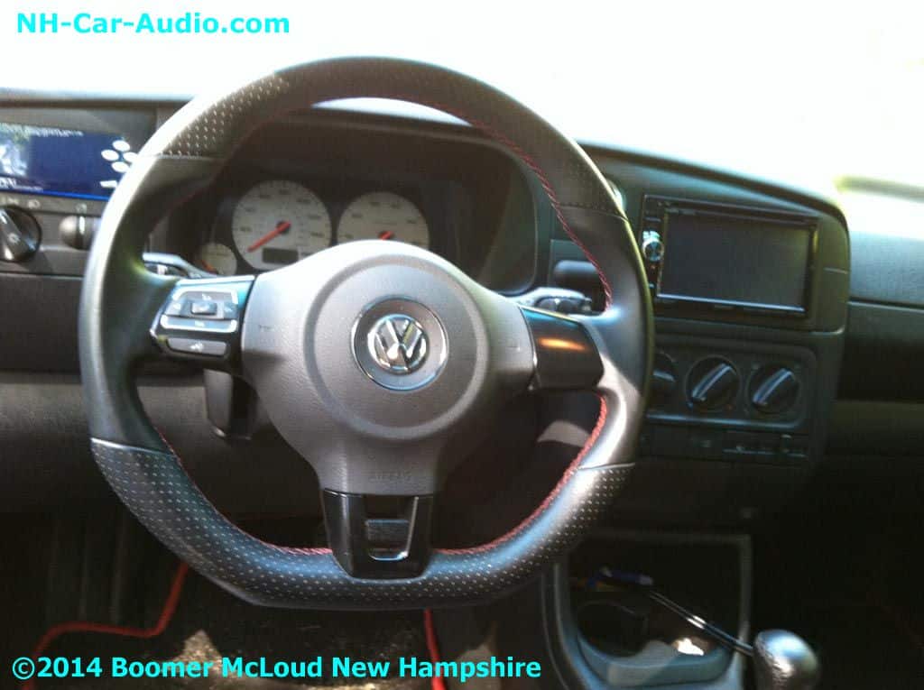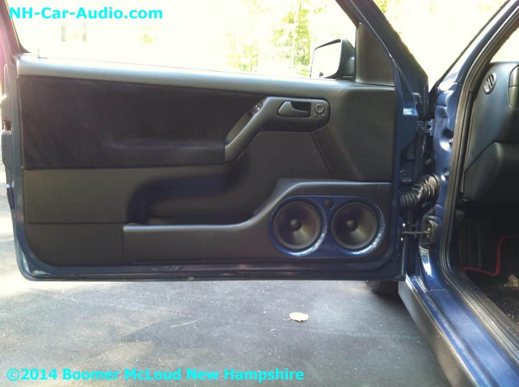 This is Ryan’s (one of us here at Boomers) car…in his spare time, he cut his VW Jetta in half and welded in a rear quarter panel from a VW GTI into where the rear doors used to be. But he didn’t stop there, he also swapped out the motor to a VR6. There’s more, he then supercharged it. This car is a great example of the kinds of custom work we are capable of here at Boomers. In this case, none of these parts are available, so he hand made almost everything. He wanted to keep the motor compartment clear of any plastic containers so he even turned the strut tower bar into a coolant reservoir. This new creation required new (non existent) parts, the hood prop struts and the interior panels couldn’t be found anywhere, as the car doesn’t exist in the parts world as it is a one of a kind. Ryan had to hand make all the interior panels. Continuing with design plan, he even went as far as to swap the steering wheel to a 2012, just to make it different. Check out the speakers, of course, they don’t come like that from the factory. Like many other parts on this car they were all hand made.![]()